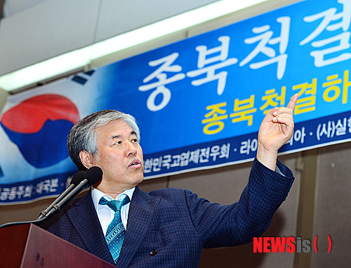 ↑ 【서울=뉴시스】박문호 기자 = 31일 오후 서울 중구 태평로 프레스센터 국제회의장에서 보수단체 주최로 열린 반국가세력 처벌촉구 대회에서 전광훈 목사가 개회사를 하고 있다. 이 행사는 대국본, 청교도영성훈련원, 고엽제전우회, 라이트코리아, 실향민중앙협의회, 비전21, 국민희망연대가 주최했다. go2@newsis.com